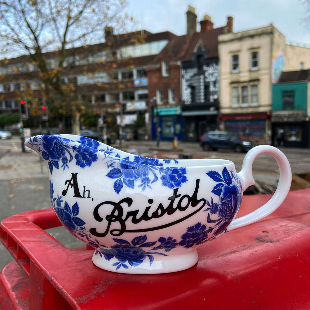 This fine English bone china gravy boat features a pun-tastic riff on our classic Bristol Blue Rose design... Ahh, Bisto!