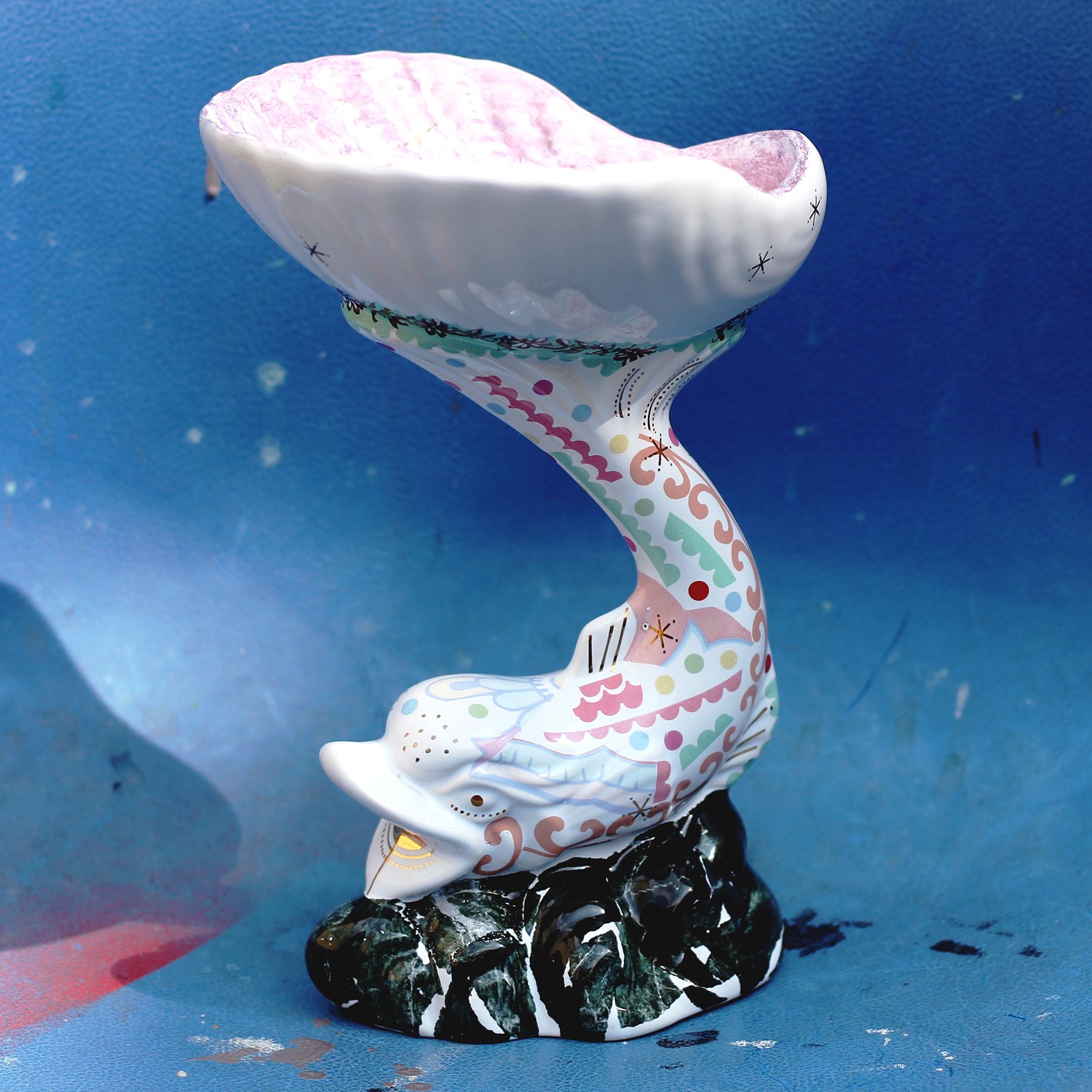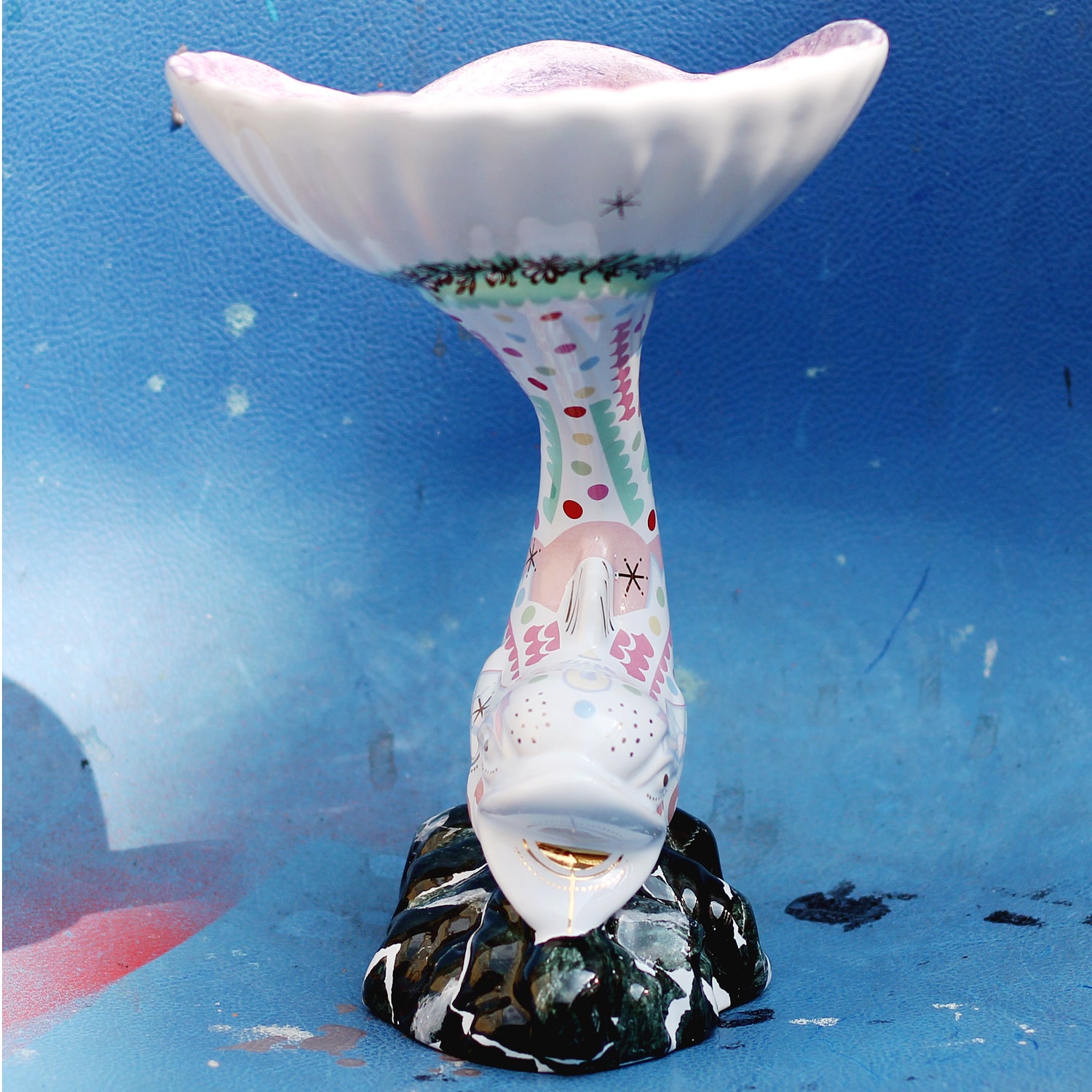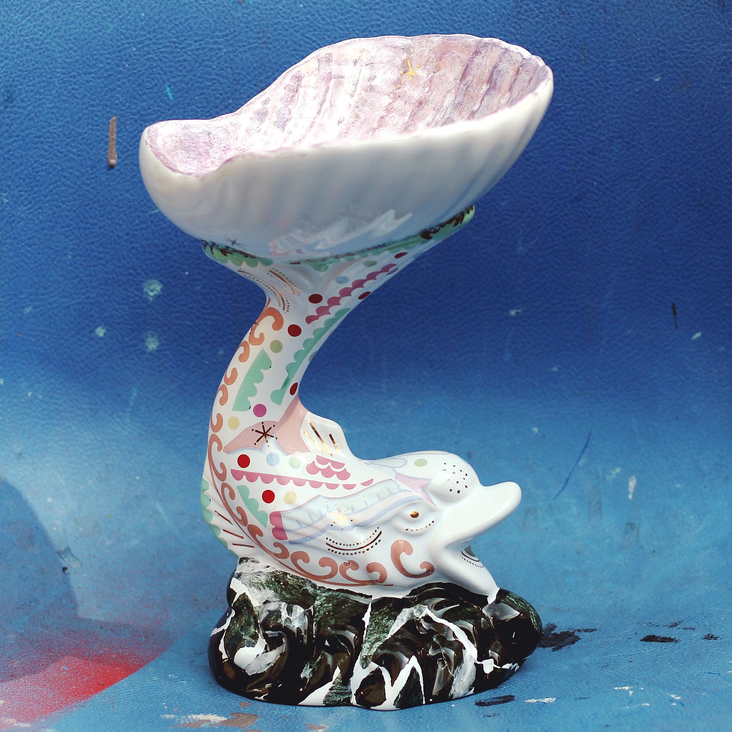 A vintage fish-holding-shell pedestal has been decorated with lots of fun, colourful vintage print and real gold detailing.