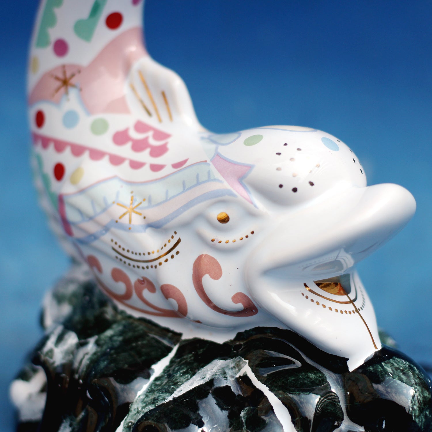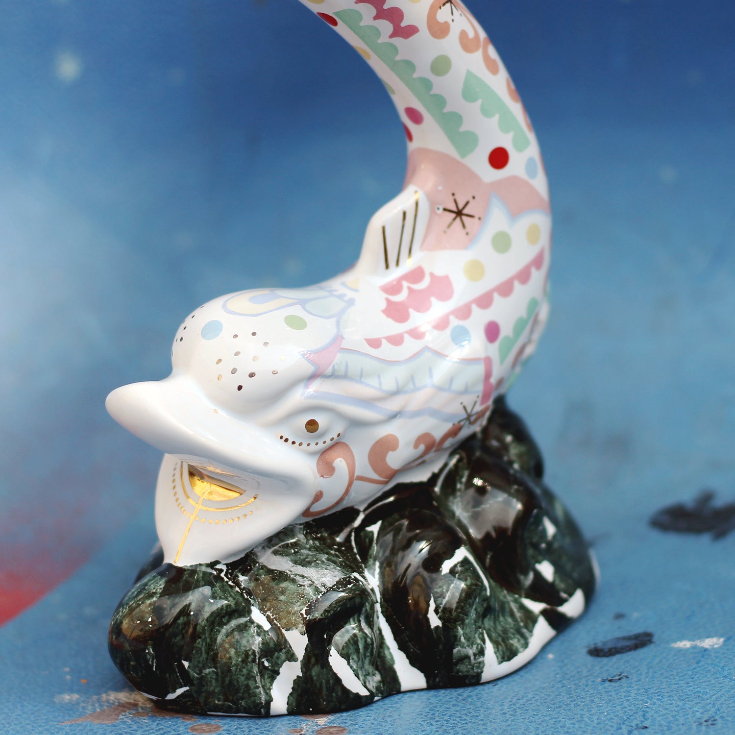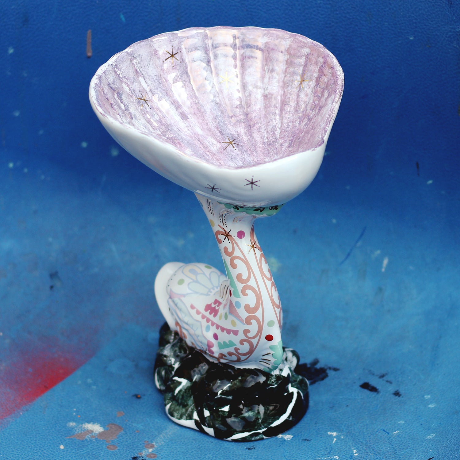 A vintage fish-holding-shell pedestal has been decorated with lots of fun, colourful vintage print and real gold detailing.