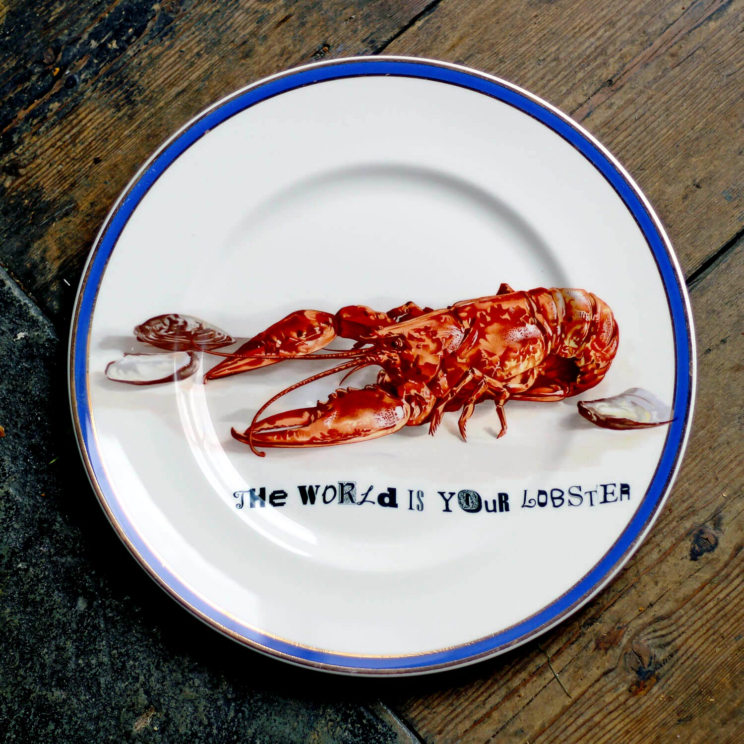 Designed by Laura using vintage lobster print on a vintage blue and gold-edged plate.