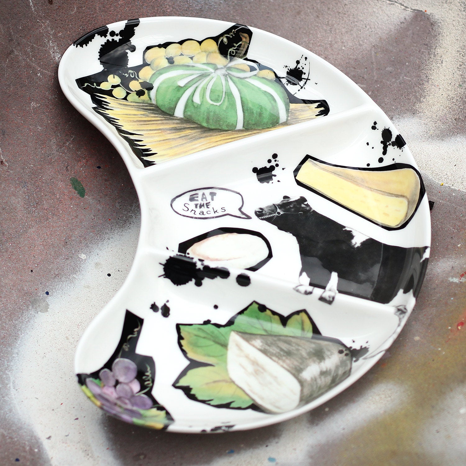 Separated snack dish for three different snacks of your choosing. I'd choose three different cheeses but you can choose dips, crudites, olives, nuts.... WHATEVER YOU LIKE!