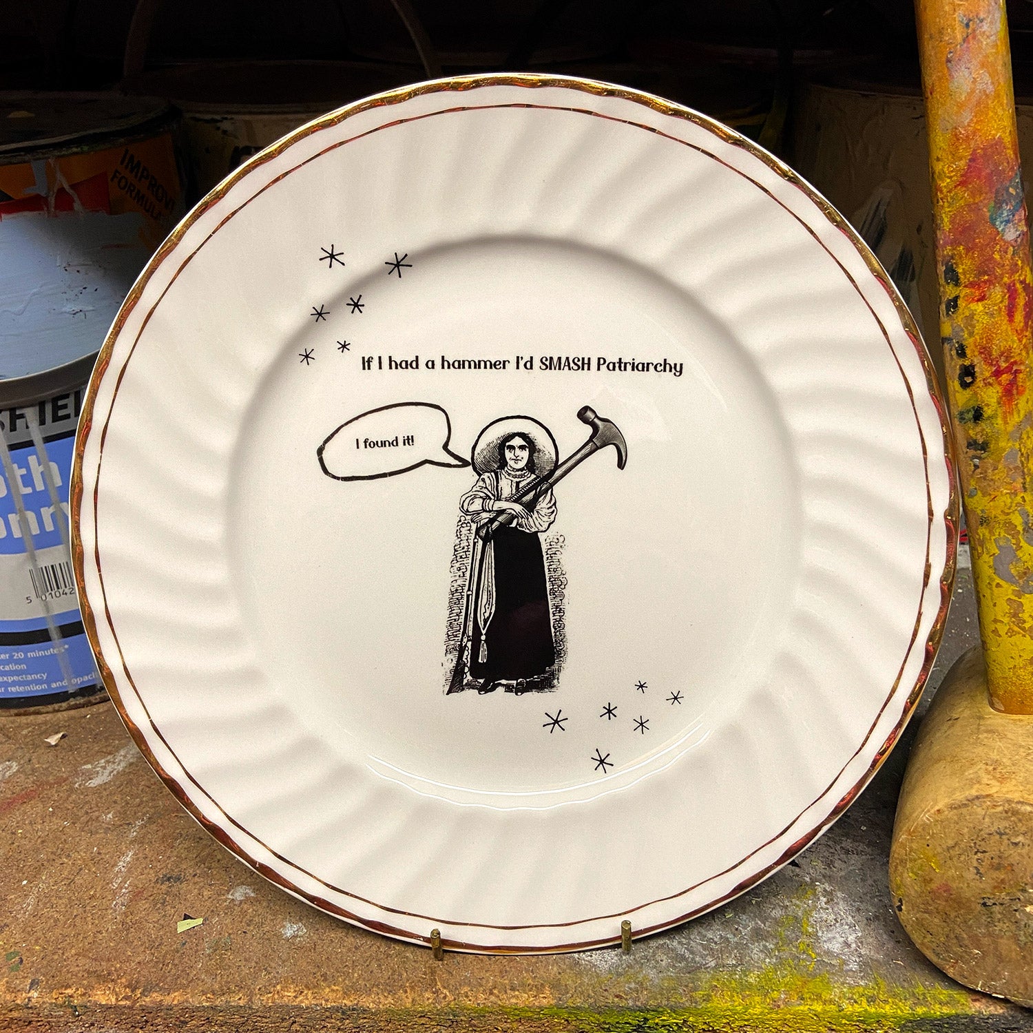 Reproduced vintage etching paired with comic-style text on a vintage gold-rimmed plate.