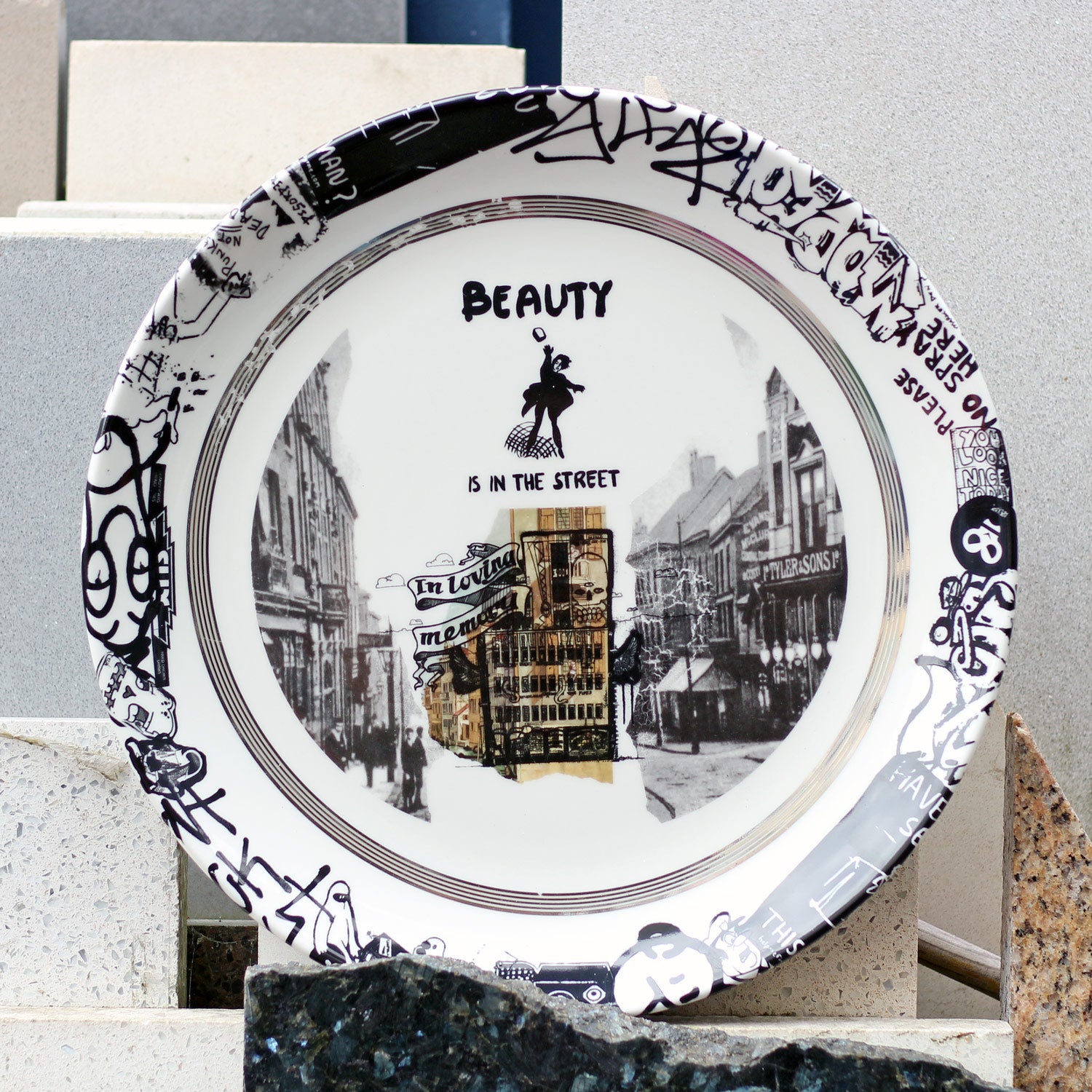 Scot's new charger features vintage photographic print, a nod to the Mai '68 protests, local icon Westmorland House and modern graffiti edging.