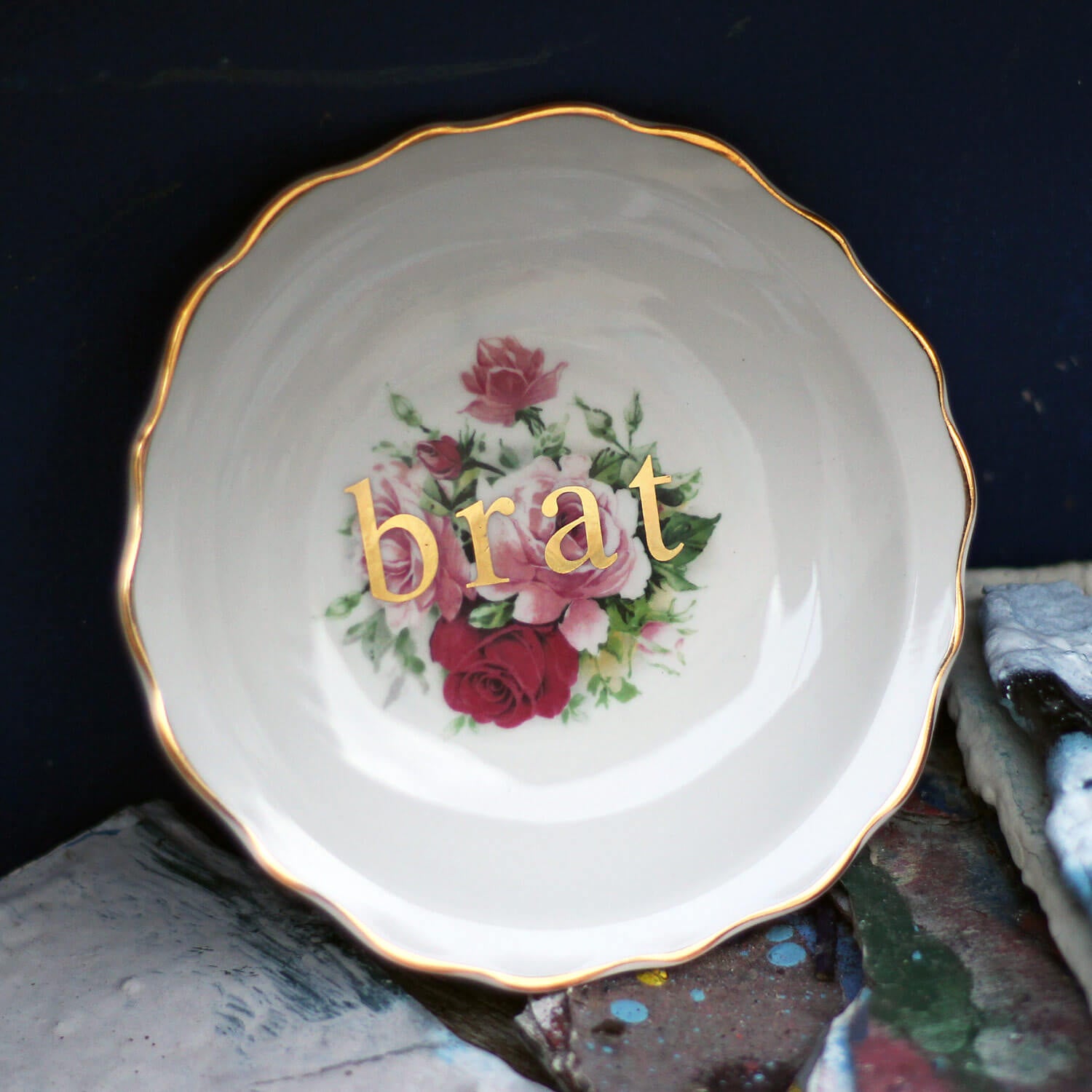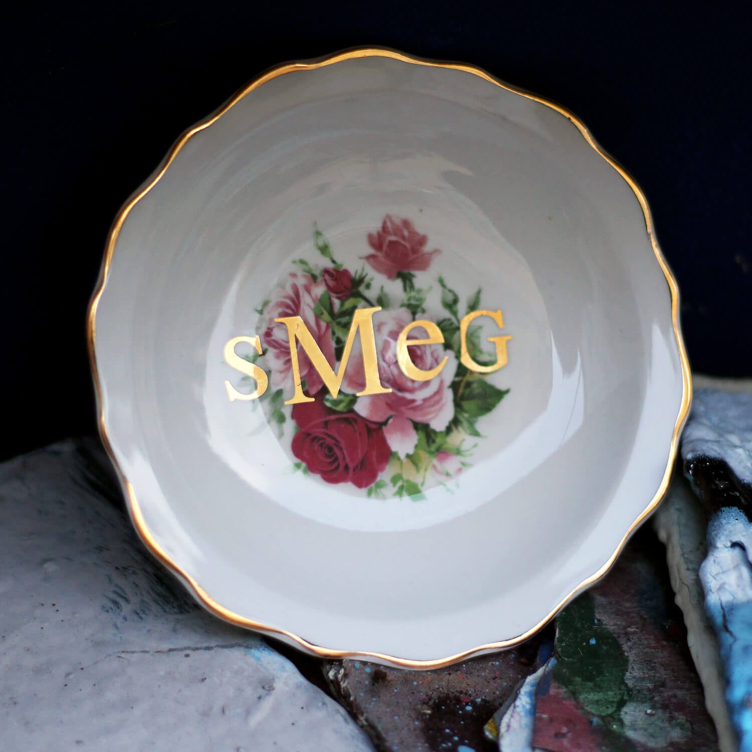 We have a bunch of these flowery little vintage trinket dishes, and we also have some vintage gold lettering.... hmmm, what can we do? SWEARS!