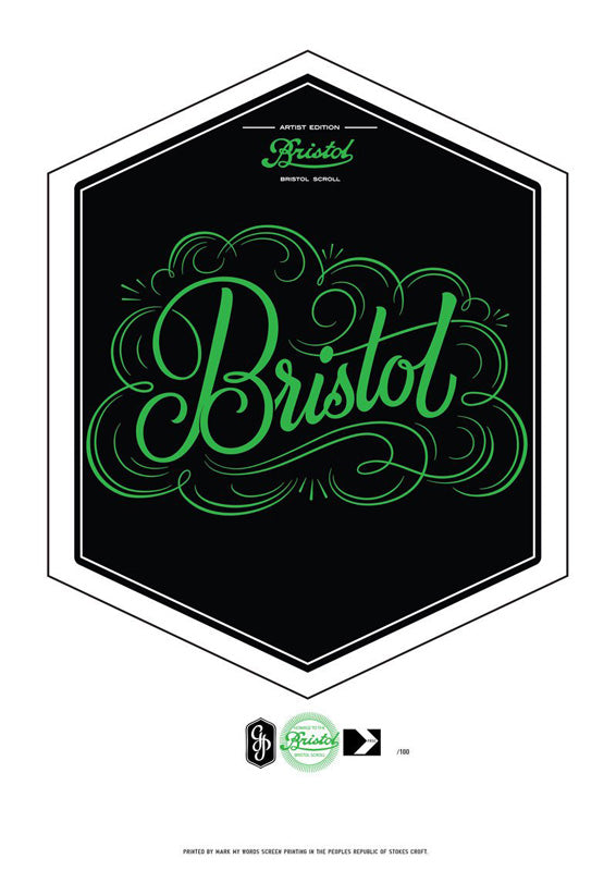 This A2 black and green print is a homage to the Bristol Scroll by Ged Palmer, one of six Bristol graffiti artists to reinterpret the scroll in their own style for PRSC here in Stokes Croft. These screen prints are part...