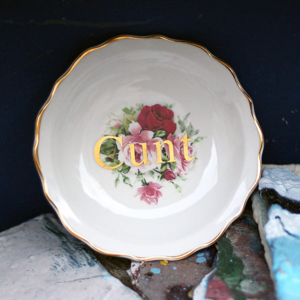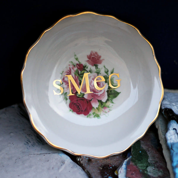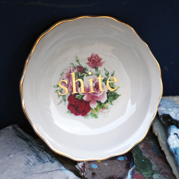 We have a bunch of these flowery little vintage trinket dishes, and we also have some vintage gold lettering.... hmmm, what can we do? SWEARS! (Photographing shiny gold is even harder than photographing shiny chinaware. We promise these are all...