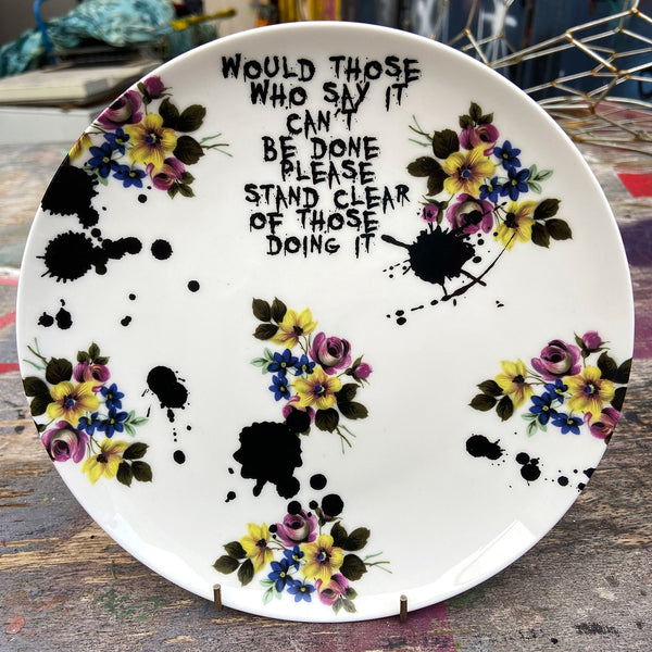 "Would those who say it can't be done please stand clear of those doing it!" A no nonsense sentiment combined with a limited supply of vintage edging motifs and some ink blots! Fine Bone China hand decorated in Bristol, England....