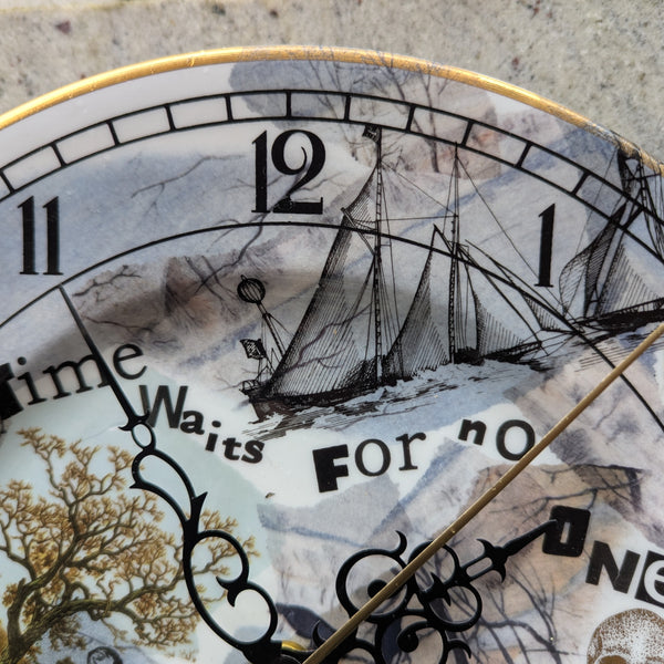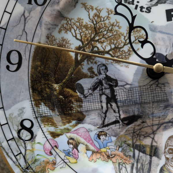 Featuring real gold highlights, Laura's intricately decorated timepiece is one of a kind. Blending vintage ceramic transfers with hand cut lettering, this stunning clock really might be an antique of the future!